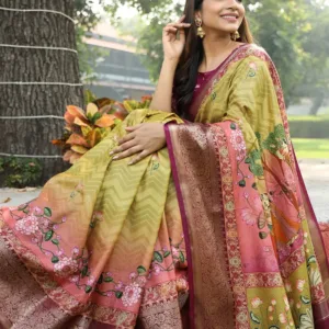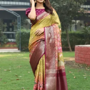 Pure Viscose Dola Silk Saree adorned with the exquisite craftsmanship of Pichwai Kalamkari Print. The pure viscose dola silk fabric drapes luxuriously that add a touch of regal splendor, reflecting the timeless elegance of tradition Whether worn for weddings, festivals, or special occasions this saree is sure to make a statement of elegance and grace.