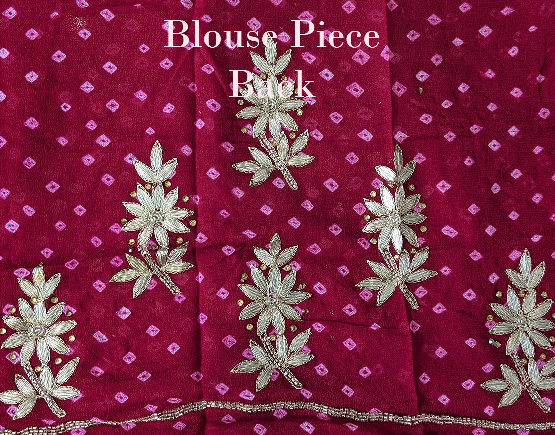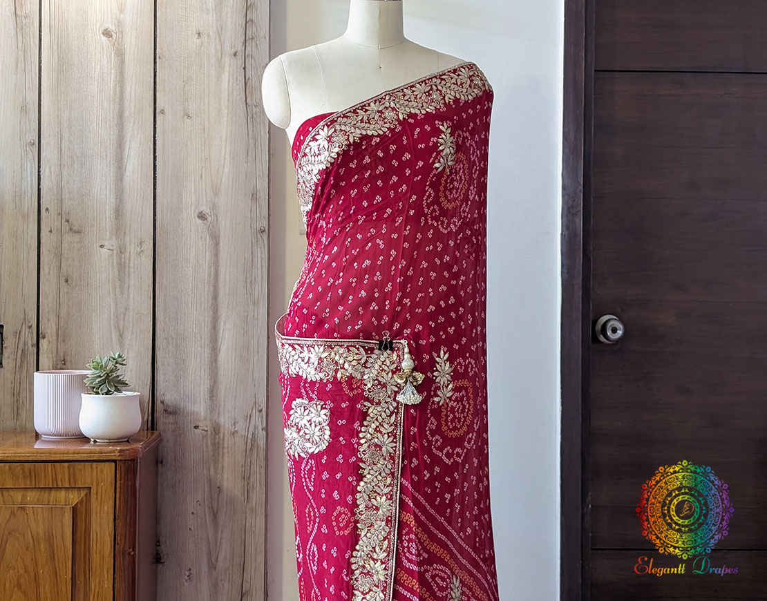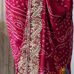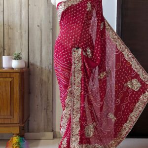 A Gorgeous Red Pure Crepe Rai Bandhej Gota Patti Saree with work done on border and bootas all over the body of the saree. Truly there is something mesmerizing about Bandhani. Furthermore, this whole technique of tie and dye dates back to the Indus Valley Civilization. The vibrant colors used and the beautiful patterns which are created, as a result makes these sarees spectacular. Hence we just cant stop falling in love with them.