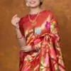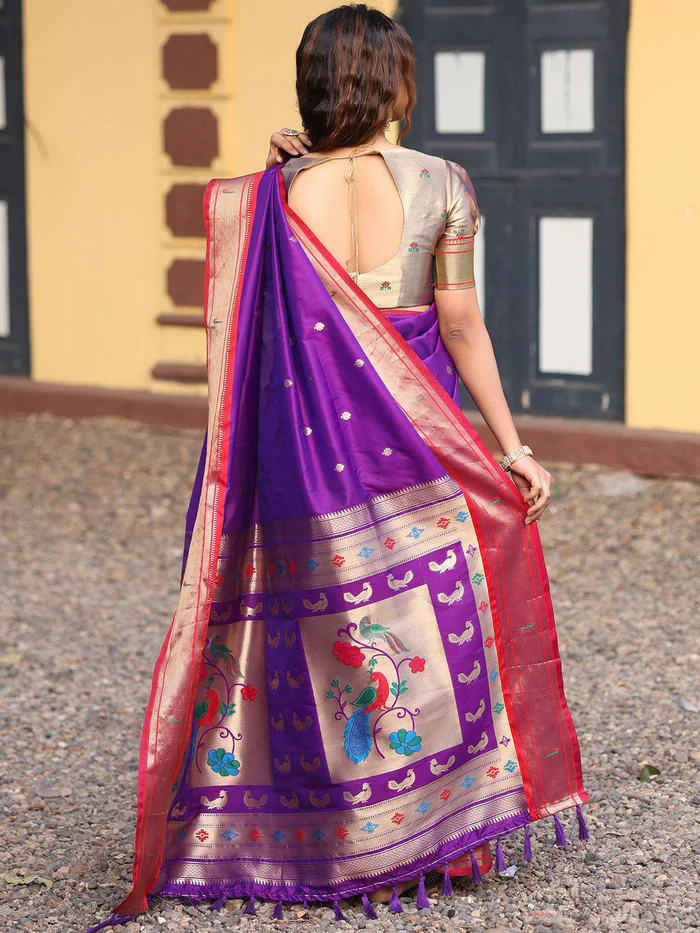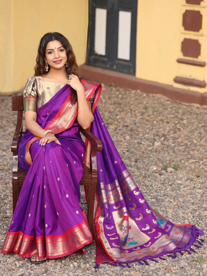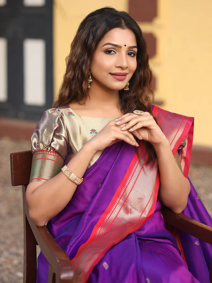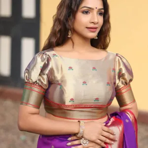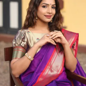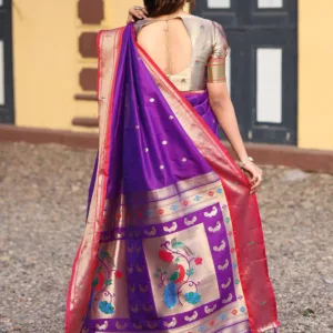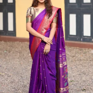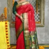 This Soft Silk Yeola Paithani saree, Delicately woven with fine Gold Zari, this saree showcases intricate patterns that epitomize the rich heritage of Paithani weaving.Whether draped for a special occasion.This Soft Silk Yeola Paithani saree is a symbol of grace and refinement.The saree include luxurious brocade blouse, perfectly complementing its traditional elegance with a touch of contemporary sophistication.